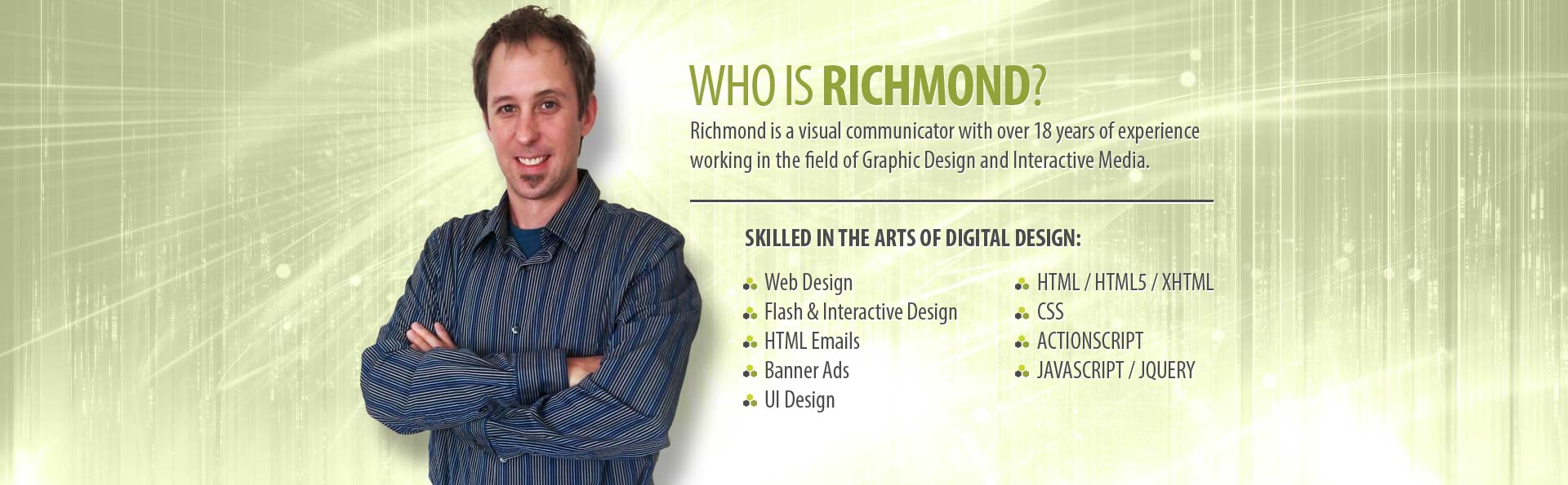 Richmond has been working in the field of digital design since 1997. He is a seasoned web designer who has worked with companies large and small throughout the United States. His strengths lie in front-end web development: Wireframes, Website Design, HTML and CSS coding. To complement those services he is also well versed in creating HTML Emails and Online Banners, skinning Social Media pages and Blogs. He taught a class on Flash at the Maryland Institute College of Art and is well versed in Flash and Audio/Video production.