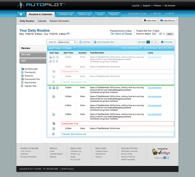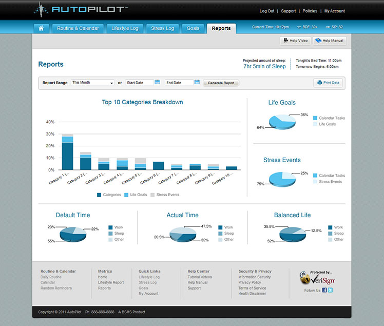 AutoPilot is a lifestyle management website. It is designed for busy individuals who want to take control of their lives. The system is designed for the user to organize their short and long-term goals into sections. These sections include a Daily Routine, a Calendar, and Lifestyle and Stress Logs. The user can also review their progress through reports. Richmond worked closely with the client to create a prototype in order to approach investors. Although the site has not yet been integrated into a back-end system, most of the front end work has been completed. Please contact Richmond if you would like to see the prototype.
