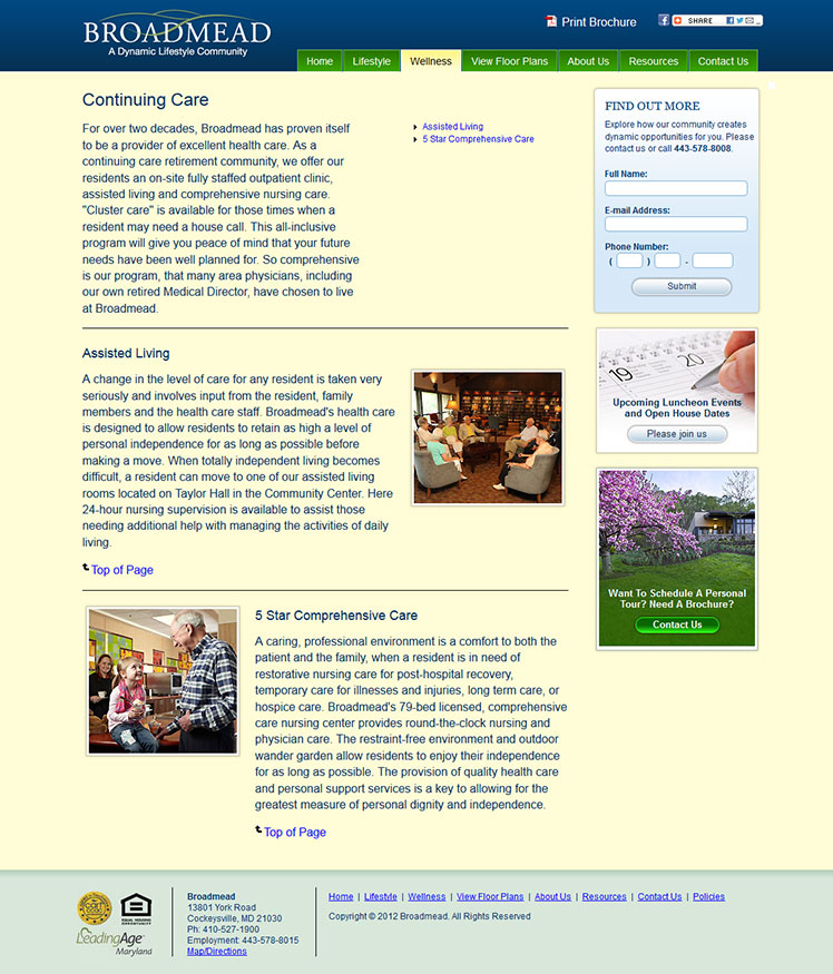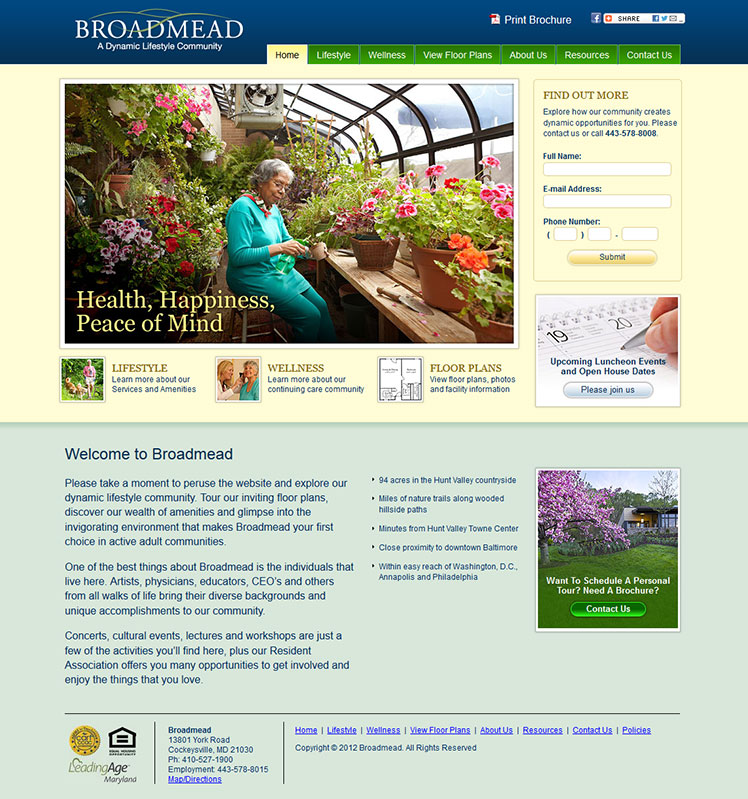 Broadmead is a not-for-profit continuing care retirement community in Hunt Valley, Maryland. The site was designed to provide information on the location, accommodations, upcoming events, and current news. Richmond integrated the site into the Adobe Contribute CMS so that the client could make regular updates on their own. Click here to visit the live site.