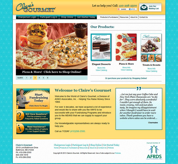 Claire’s Gourmet is a catalog fundraising company. Their primary fundraising products include foods such as pizzas, cakes and baked goods. Their website is an online store and fundraising resource, as well as a marketing asset. The site is a responsive one. Click here to visit the live site.