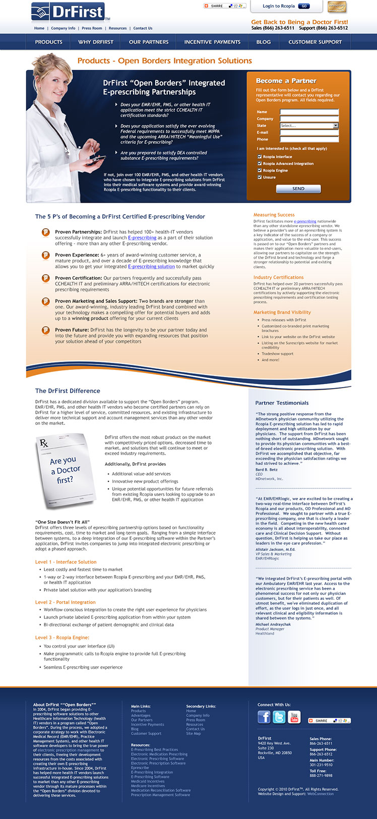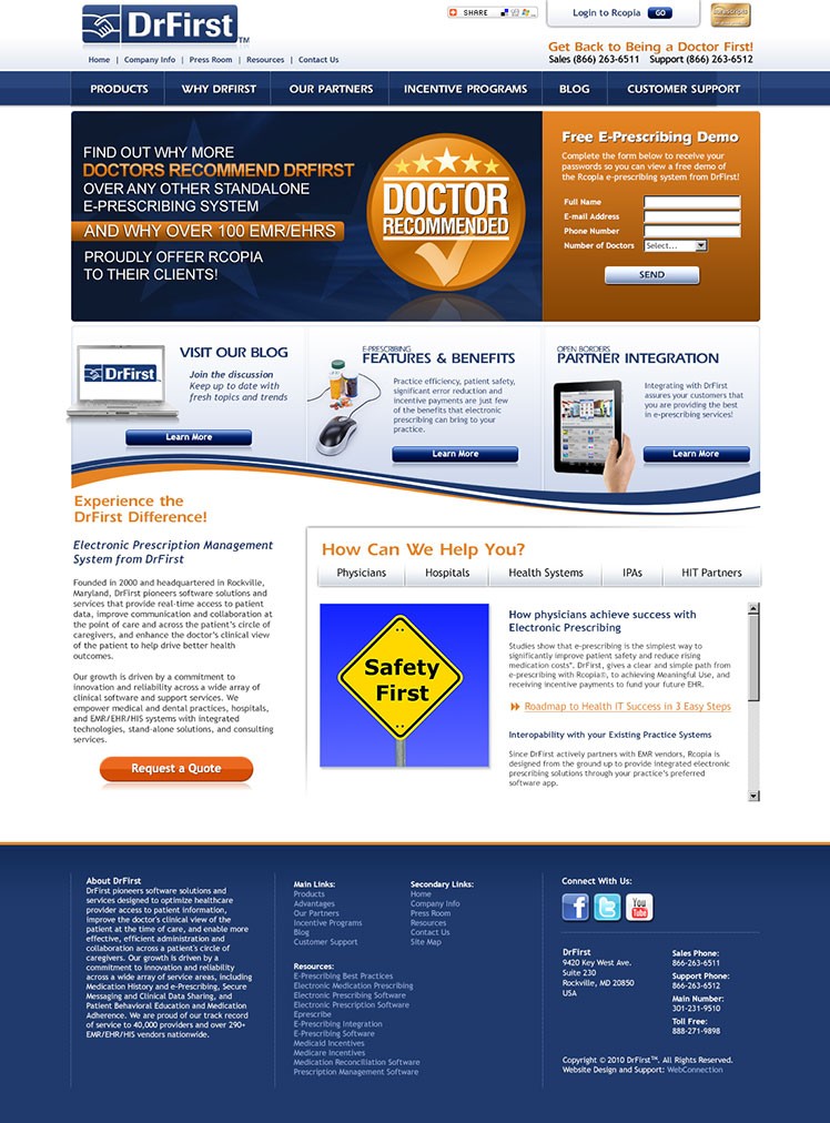 DrFirst creates software solutions and services that provide real-time access to patient data, improves communication and collaboration at the point of care, and enhances the doctor’s clinical view of the patient. Along with creating and coding the design, Richmond worked closely with the client to make the site SEO friendly. The site was created in 2010 and has since been modified by other companies but Richmond's original design continues to shine through.